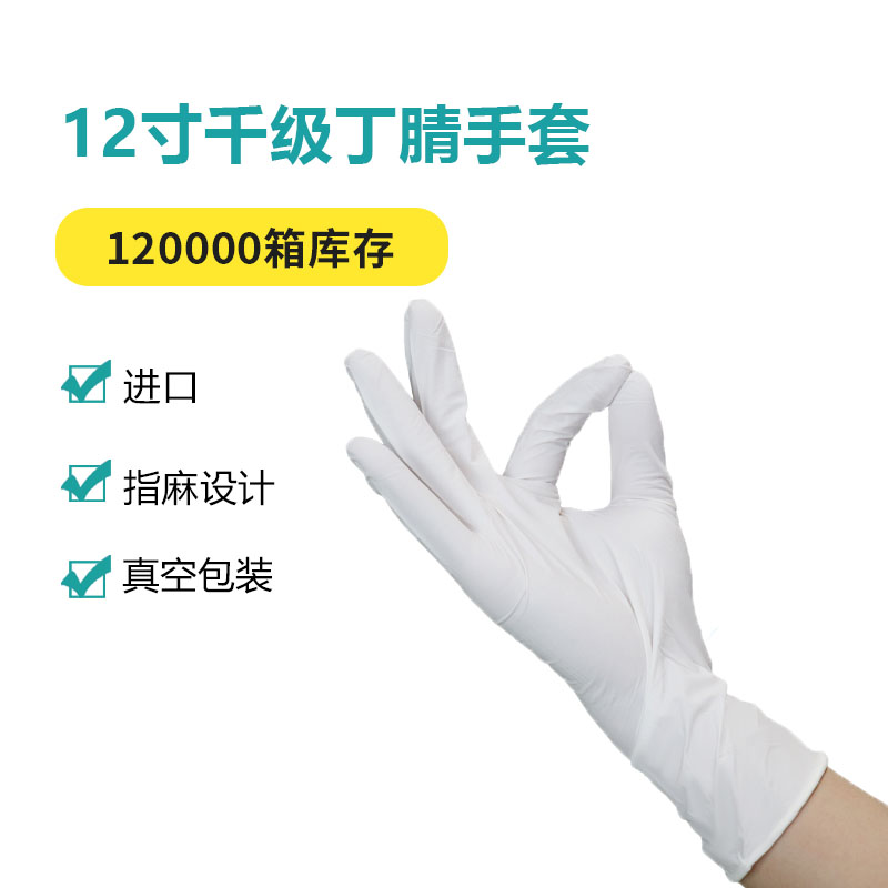 长度≥300MM,丁腈橡胶材质,指麻设计,双重氯洗加高纯水洗,手套表面LPC<2500,无指印残留,符合RoHS标准,低化学残留物和非挥发性残留物。适用于电子半导体行业、芯片制造、液晶面板、硬盘生产、精密仪器制造与光学加工等行业。