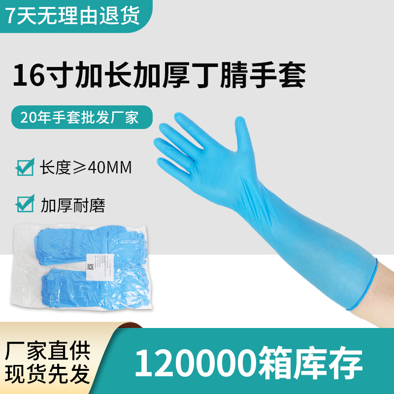 16 寸蓝色丁腈手套在多个场景有广泛应用。在医疗领域,它常被医护人员用于手术操作、检查、护理等,其良好的弹性和耐用性能提供稳定的操作感和有效防护。食品加工行业也